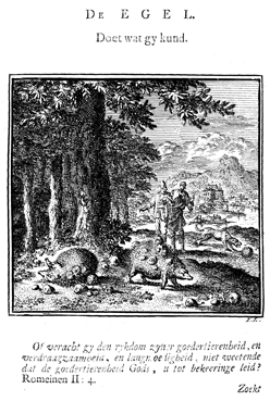 Description: Two men contemplate two hedge-hogs which are rolling on the ground in order to pick up fallen fruit. Behind the men a hedgehog is rolled into a ball to defend itself from an attack by a dog. The Dutch artist and poet Jan Luiken (1649-1712), whose initials are at the lower right, was responsible for drawing and etching this emblem, as well as for the poem that accompanies it (below).