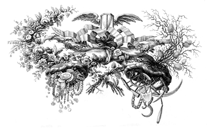 Description: An ornamental tailpiece illustrating both wealth and death, with a winged hourglass at the head.