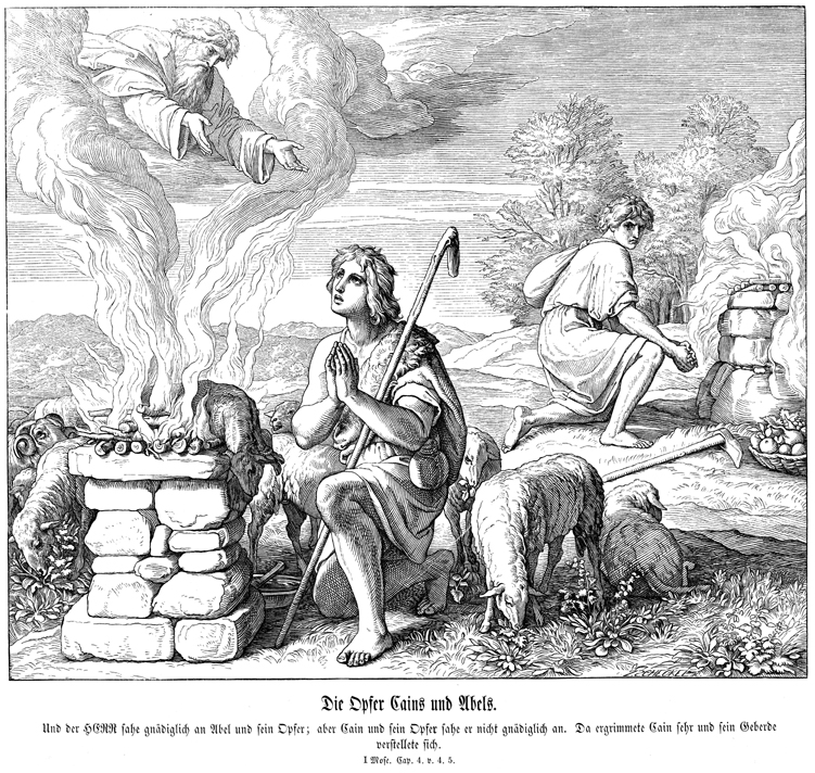Description: Julius Schnorr von Carolsfeld's (1794-1872) depiction of Cain and Abel offering sacrifices to God. Cain broods (right), while God favors Abel’s offering. The engraver’s name, Carl August Zscheckel (1824-1870), appears at the bottom right.