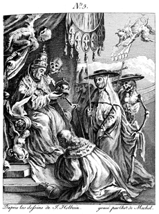 Description: The Pope, wearing the papal triple tiara, crowns the emperor (the globus cruciger on the ground before him), as cardinals, bishops, skeletons (representing death; one in cardinal's garb), and two flying demons (one with papal decree in hand) look on. Engraved by Chrétien de Mechel (1737–1817) after the original design by Hans Holbein, the Younger (1498–1543).