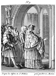 Description: As a canon holding an hour-glass(=human mortality) and wearing a sable stole enters a church, Death joins him to announce that his time has come. Engraved by Chrétien de Mechel (1737–1817) after the original design by Hans Holbein, the Younger (1498–1543).