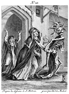 Description: Death leads away an abbess with her rosary and a crosier. In the lower left corner is an hourglass, representing human mortality. Engraved by Chrétien de Mechel (1737–1817) after the original design by Hans Holbein, the Younger (1498–1543).