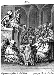 Description: As a preacher addresses his congregation, Death taps on his shoulder to announce that his time has come. Engraved by Chrétien de Mechel (1737–1817) after the original design by Hans Holbein, the Younger (1498–1543).