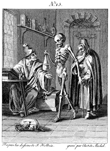 Description: Death visits a physician, bringing urine in a vial and leading an old man. Engraved by Chrétien de Mechel (1737–1817) after the original design by Hans Holbein, the Younger (1498–1543).