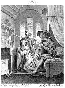 Description: A canoness (nun) kneels at an altar to pray, as Death extinguishes the candles. The nun is distracted from her prayers by a young man sitting on the bed playing a lute. An overturned hourglass, representing human mortality, appears nearby. Engraved by Chrétien de Mechel (1737–1817) after the original design by Hans Holbein, the Younger (1498–1543).