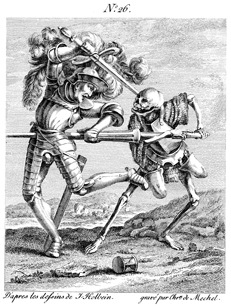 Description: Death runs a lance through a knight and his armor. An hourglass, the reminder of human mortality, lies overturned at their feet. Engraved by Chrétien de Mechel (1737–1817) after the original design by Hans Holbein, the Younger (1498–1543).