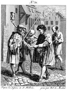 Description: Death holds an hourglass, representing human mortality, over an advocate. The advocate is seen eagerly accepting a bribe in a dispute involving the poor man at the left. Engraved by Chrétien de Mechel (1737–1817) after the original design by Hans Holbein, the Younger (1498–1543).