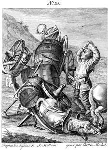 Description: Skeletons representing death wreck a waggoner’s cart. Engraved by Chrétien de Mechel (1737–1817) after the original design by Hans Holbein, the Younger (1498–1543).