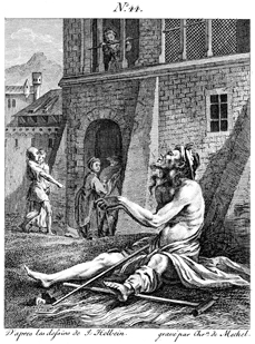 Description: A lame beggar sits outside a rich man's house, but the affluent who enter the home pay little attention to him or his deplorable condition. While the beggar wishes for death so that he will be relieved of his suffering, Death would take away the lives of those who find themselves content and comfortable, such as the rich who have just ignored the beggar. Engraved by Chrétien de Mechel (1737–1817) after the original design by Hans Holbein, the Younger (1498–1543).