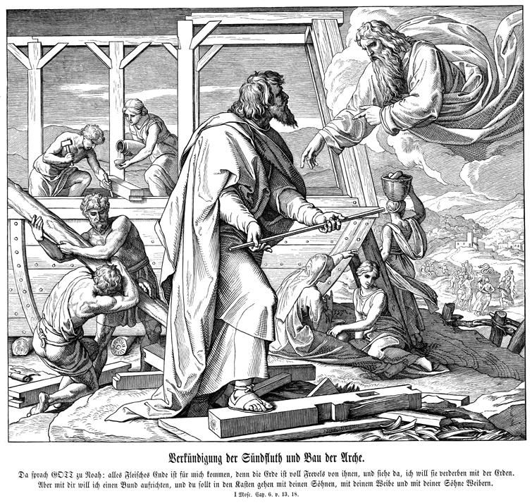 Description: Julius Schnorr von Carolsfeld's (1794-1872) depiction of Noah and his sons constructing the ark under God's instructions (front) as the people of earth worship an idol and live in revelry and sin (back).