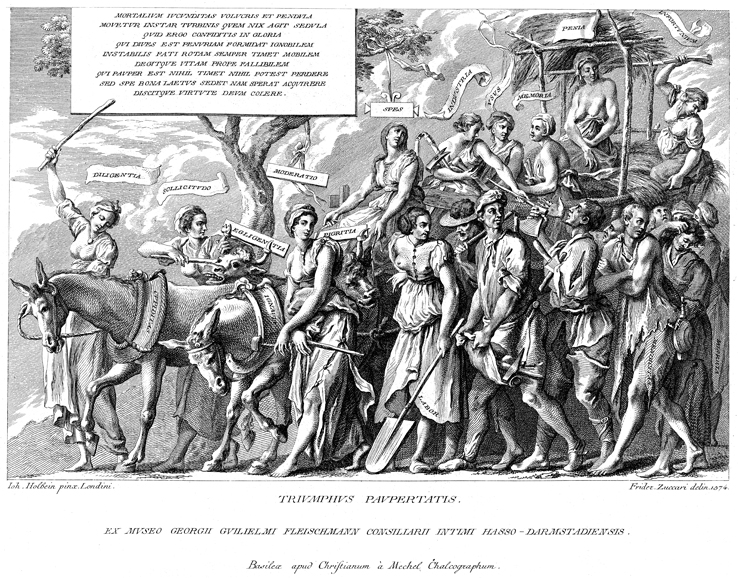 Description: A depiction of the causes and effects of poverty. Hope (“Spes”) drives the cart, followed by Industry (“Industritia”), Practice (“Usus”), and Memory (“Memoria”). Industry is seen giving tools to a craftsman. Diligence (“Diligentia”), Care (“sollicitudo”), Moderation (“Moderatio”), and Work (“Labor”) stuggle to keep the horses and oxen in line, which embody desire (“cupiditas”), cowardice (“ignavia”), negligence (“negligentia”), and laziness (“pigritia”). Atop the cart ride Punishment (“Penia”) and Misfortune (“Infortunium”). Engraved by Federico Zuccari (1542/3–1609) after the original design by Hans Holbein, the Younger (1498–1543).