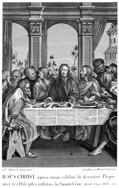 Description: A depiction of the Last Supper, with Jesus surrounded by his disciples. Engraved by Chrétien de Mechel (1737–1817) after the original design by Hans Holbein, the Younger (1498–1543).