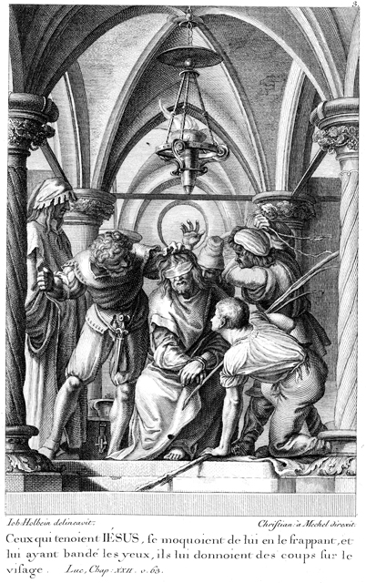 Description: This engraving depicts Jesus being blindfolded, beaten, and taunted by men asking him to prophesy as to who it was that hit him (Luke 22:63). Engraved by Chrétien de Mechel (1737–1817) after the original design by Hans Holbein, the Younger (1498–1543).