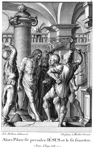 Description: Jesus is flogged by Roman soldiers, as Jewish leaders look on (John 19:1). Engraved by Chrétien de Mechel (1737–1817) after the original design by Hans Holbein, the Younger (1498–1543).
