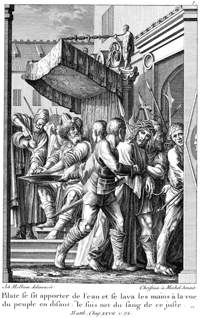 Description: Pilate washes his hands, as Jesus is led away to be crucified (Matthew 27:24). Engraved by Chrétien de Mechel (1737–1817) after the original design by Hans Holbein, the Younger (1498–1543).
