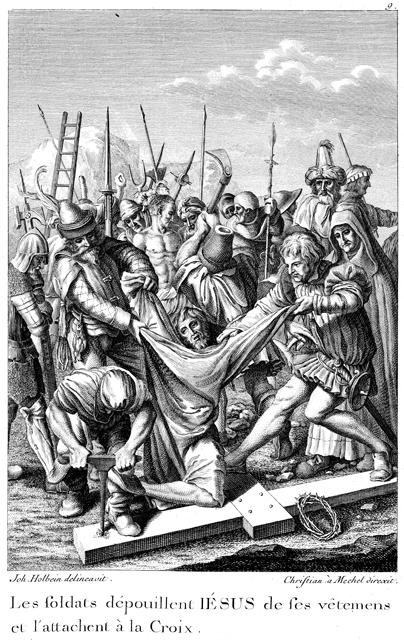 Description: Jesus is stripped of his clothes prior to being nailed to the cross. Engraved by Chrétien de Mechel (1737–1817) after the original design by Hans Holbein, the Younger (1498–1543).