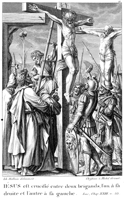 Description: Jesus is crucified between two criminals (Luke 23:33). Engraved by Chrétien de Mechel (1737–1817) after the original design by Hans Holbein, the Younger (1498–1543).