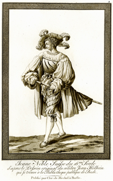 Description: A 16th-century young Swiss noble in typical clothing, after the original design by Hans Holbein, the Younger (1498–1543).