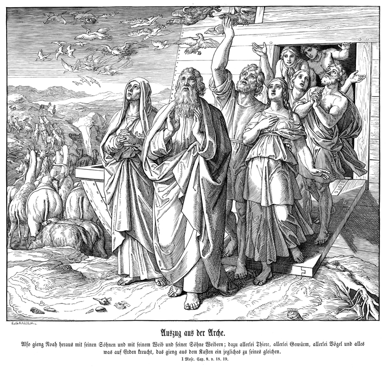 Description: This image, by Julius Schnorr von Carolsfeld's (1794-1872), depicts Noah and his family exiting the ark and praising God.