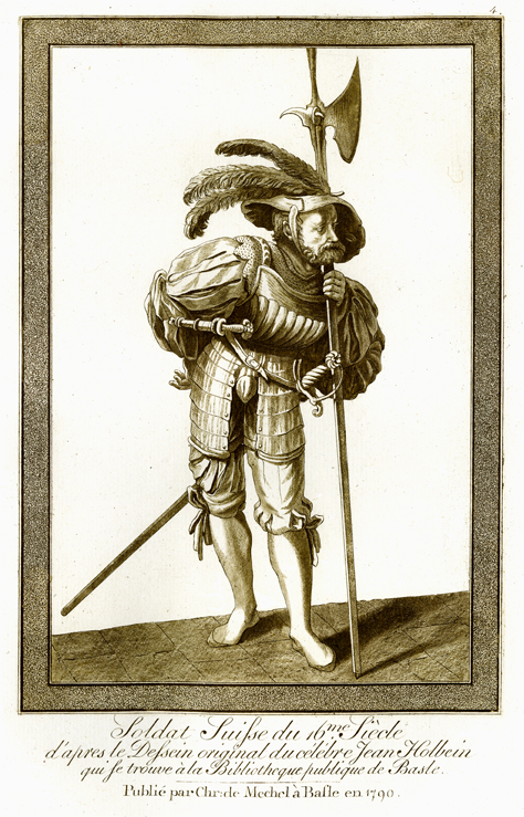 Description: A 16th-century Swiss soldier in full regalia, after the original design by Hans Holbein, the Younger (1498–1543).