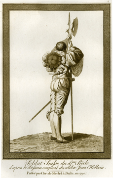 Description: A 16th-century Swiss soldier in full regalia, after the original design by Hans Holbein, the Younger (1498–1543).