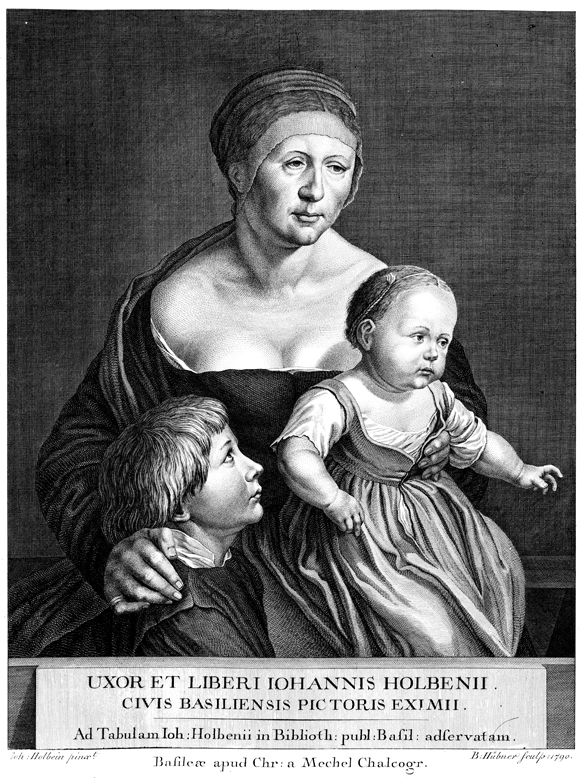 Description: A portrait of Hans Holbein, the Younger’s (1498–1543) wife Elsbeth and his children, Philipp and Katherina. Engraved by Bartholome Hübner (b. 1727), after Holbein’s own painting.
