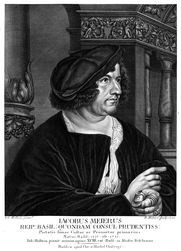 Description: A portrait of Jakob Meyer zum Hasen (1482-1531), a mayor of Basel, Germany, from 1516 to 1521. Engraved by Bartholome Hübner (b. 1727), after the work of Hans Holbein, the Younger (1498-1543).