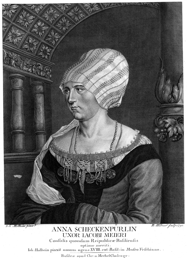 Description: A portrait of Jakob Meyer zum Hasen’s wife, Anna Scheckenpürlin. Engraved by Bartholome Hübner (b. 1727), after the work of Hans Holbein the Younger (1498–1543).