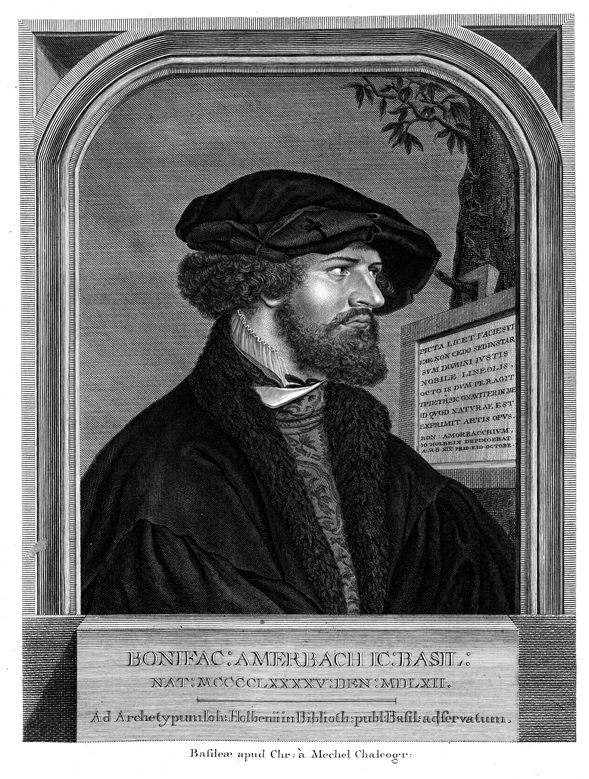 Description: A portrait of Boniface Amerbach (1495–1562), a professor at Basel University and friend of Hans Holbein the Younger (1498–1543). This is an engraving after the original painting by Holbein himself.