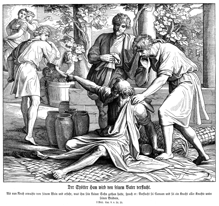Description: Julius Schnorr von Carolsfeld's (1794-1872) depiction of Noah, with Shem and Japheth by his side, cursing Ham after discovering that he has seen him naked.