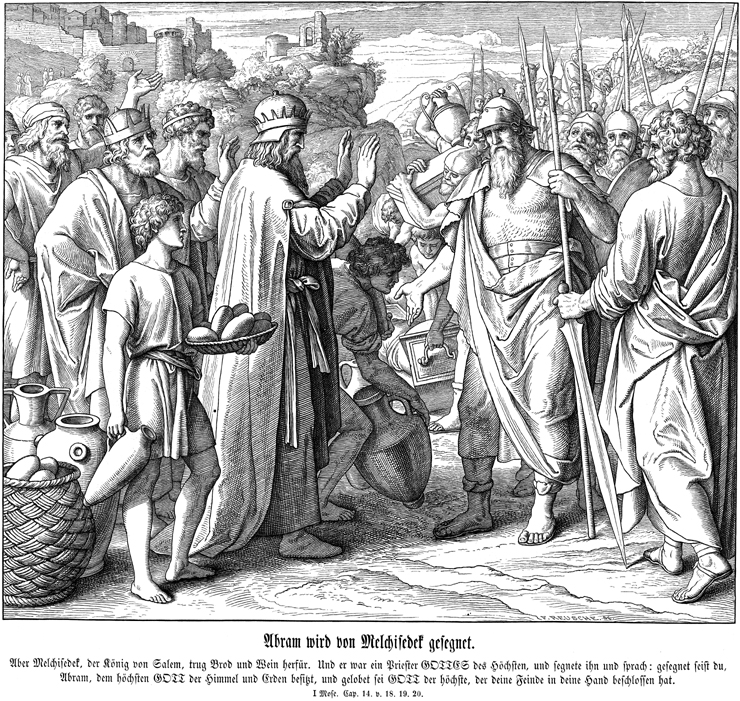 Description: Julius Schnorr von Carolsfeld's (1794-1872) depiction of Melchizedek, King of Salem, providing Abram and his army with bread and wine and receiving from Abram a tithe of the spoils of war.