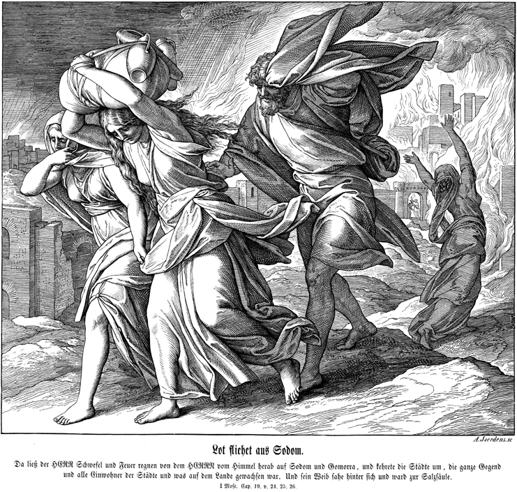 Description: This woodcut by Julius Schnorr von Carolsfeld (1794-1872) depicts Lot and his family leaving Sodom as the city burns in the background. Lot's wife looks back before turning into a pillar of salt. The engraver’s signature, A. Joerdens, appears at the bottom right corner.