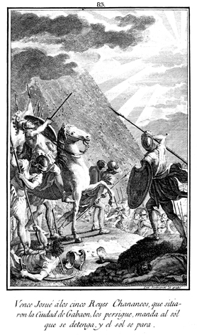 Description: Israel defeats the Amorites at Gibeon with the help of God, who rains down stones upon the Amorites and causes the sun and the moon to stand still. The engraver’s name is located at the lower right corner.
