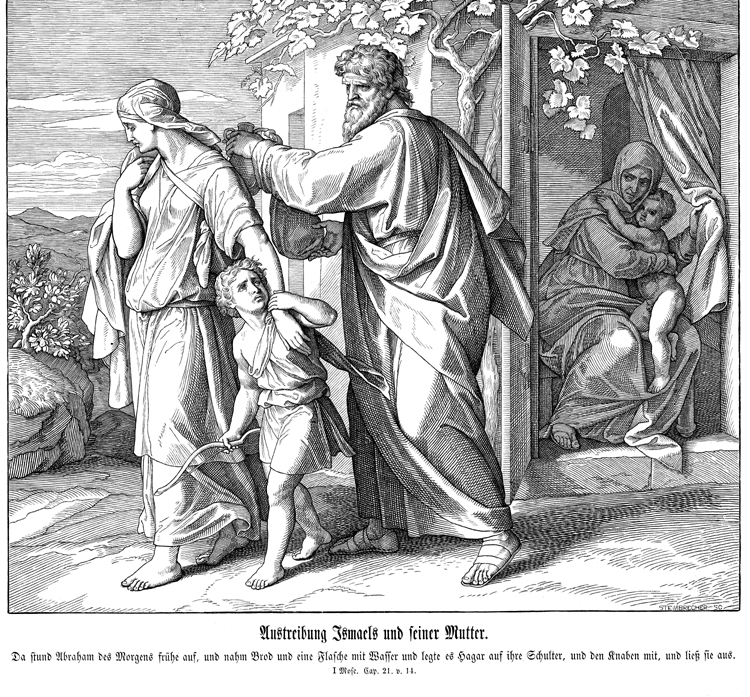 Description: This image by Julius Schnorr von Carolsfeld (1794-1872), depicts Sarah and Isaac sitting in the doorway, as Abraham reluctantly honors Sarah’s request by asking Hagar and Ishmael to leave. TThe engraver’s name, Gustav Richard Steinbrecher (1828-1887), is located at the bottom right corner.