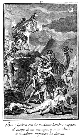 Description: Gideon and the Israelite army defeat the Midianites at night. The engraver’s name is located at the lower right corner.