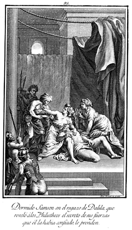 Description: Delilah cuts Samson’s hair, as the Philistines wait to seize him. The engraver’s name is located at the lower right corner.