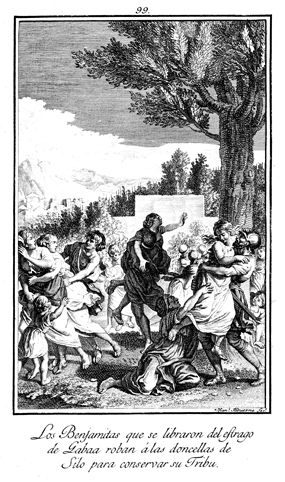 Description: The Benjamites capture maidens from Shiloh, when the young women came to dance in the vineyards, and take them for their wives. The engraver’s name is located at the lower right corner.