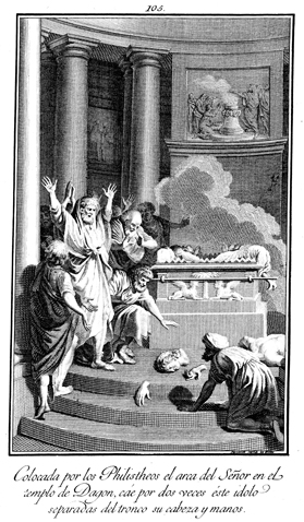 Description: The priests of the Temple of Dagon discover the idol destroyed, after leaving the Ark of the Covenant in the temple overnight. The engraver’s name is located at the lower right corner.