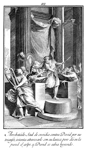 Description: Saul throws his spear at David, while David plays the harp. The engraver’s name is located at the lower right corner.