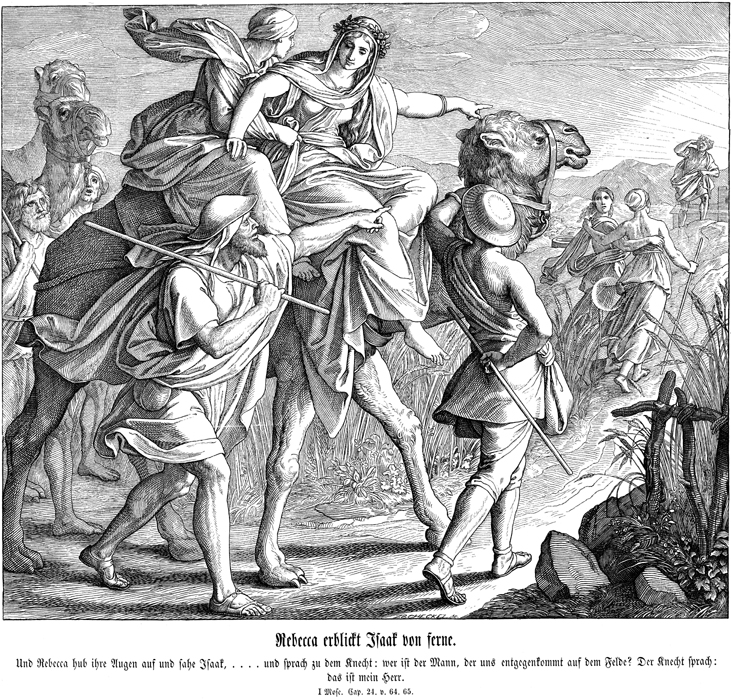 Description: This woodcut by Julius Schnorr von Carolsfeld (1794-1872), depicts Abraham’s servant bringing Rebekah to meet Isaac for the first time. The engraver’s name, Carl August Zscheckel (1824-1870), is located at the bottom center of the woodcut.