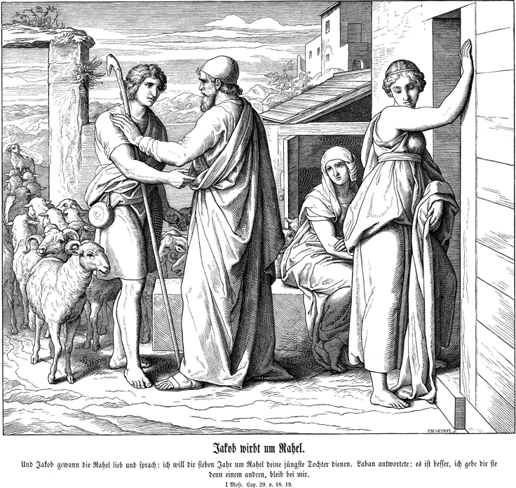 Description: Julius Schnorr von Carolsfeld's (1794-1872) depiction of Laban agreeing to let Jacob marry Rachel in exchange for seven years of work. The name of the engraver (Carl August Zschekel, 1824-1870) appears in the bottom right corner of the woodcut.