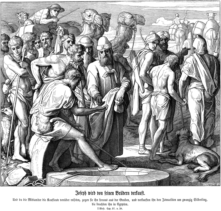 Description: After lifting Joseph out of the cistern, Joseph’s brothers negotiate with the Ishmaelites to sell him for twenty shekels of silver. In the background (left), one of Joseph’s brothers suggests dipping his coat in goat’s blood and taking it back to their father. The engraver’s name, Gustav Richard Steinbrecher (1828-1887), appears at the lower right.