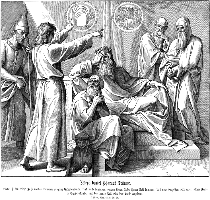 Description: This woodcut by Julius Schnorr von Carolsfeld (1794-1872) depicts Pharaoh and of Egypt’s premiere magicians and wise men listening with great wonder, as Joseph interprets Pharaoh’s dreams of the seven fat and seven lean cows, and the seven good and seven lean stalks. Each dream is represented by the plaques hanging above Pharaoh’s head.