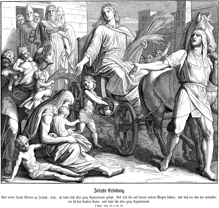 Description: This woodcut by Julius Schnorr von Carolsfeld (1794-1872) depicts Joseph’s promotion to vice-regent in Egypt, while the people in the streets praise him as he rides in Pharaoh’s chariot. The engraver’s name, Gustav Richard Steinbrecher (1828-1887), appears at the lower right.