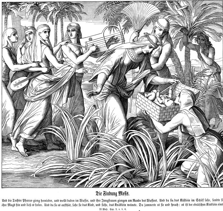 Description: Julius Schnorr von Carolsfeld's (1794-1872) depiction of Pharaoh's daughter finding Moses amoong the reeds of the Nile River; Miriam watches in the background.