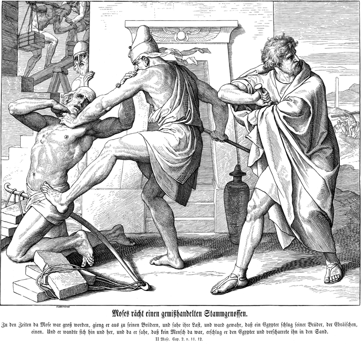 Description: Julius Schnorr von Carolsfeld's (1794-1872) depiction of an Egyptian and a Hebrew fighting; Moses draws his sword to kill the Egyptian, making sure no one is watching.