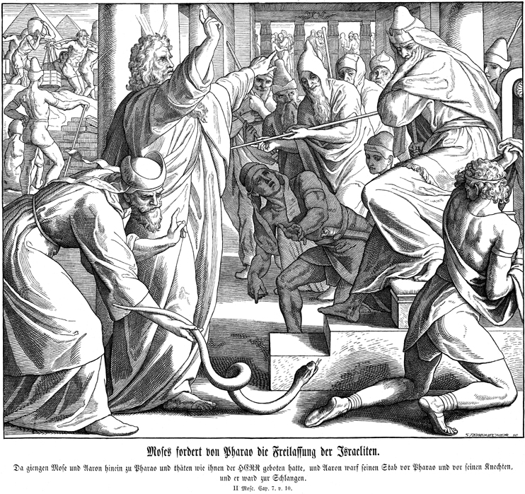 Description: Julius Schnorr von Carolsfeld's (1794-1872) depiction of Aaron's staff turning into a snake as Moses appears before Pharaoh in Egypt; the Hebrews are depicted in slavery in the background.
