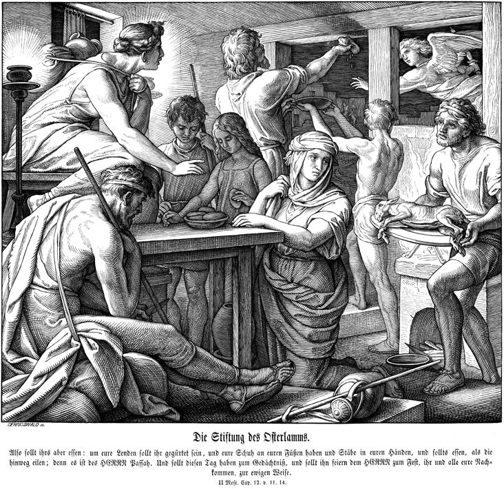 Description: Julius Schnorr von Carolsfeld's (1794-1872) depiction of the angel of death passing by as lamb's blood is placed on the doorframe and Israelites eating the Passover meal, while standing around a table with staffs in hand.