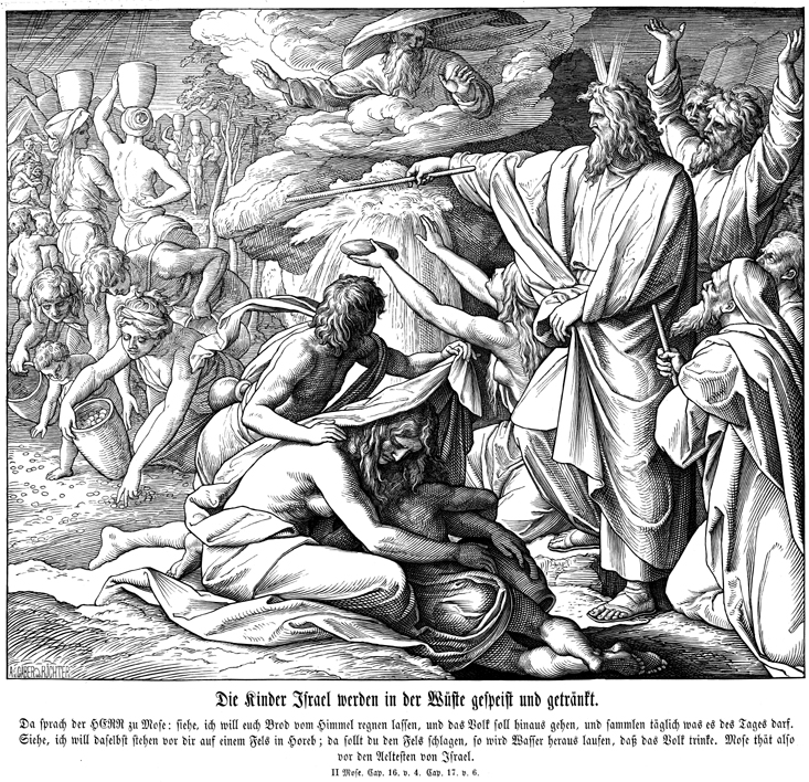 Description: Julius Schnorr von Carolsfeld's (1794-1872) depiction of the Israelites gathering manna as it falls from heaven (left) and Moses bringing water from the rock at Meribah by following God’s command to strike the rock with the staff he used at the Nile (right).