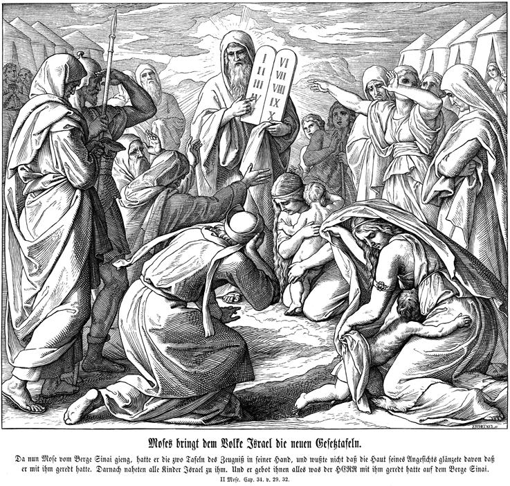 Description: Julius Schnorr von Carolsfeld's (1794-1872) depiction of Moses presenting the new tablets of the Ten Commandments to the Hebrews.